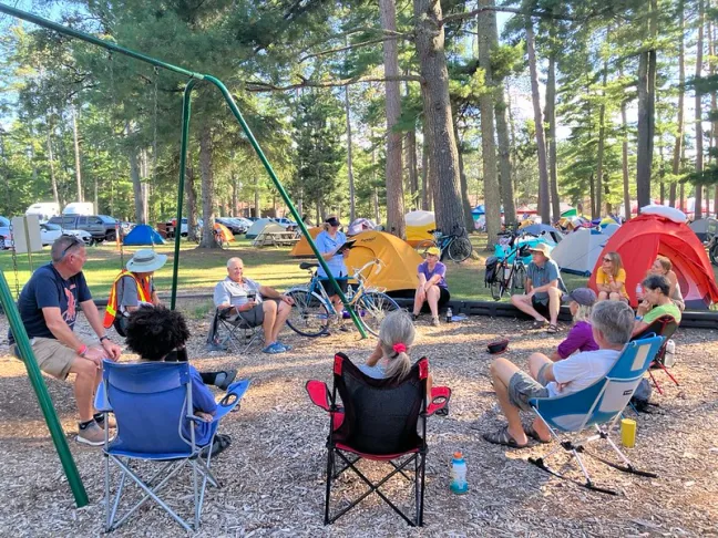“That evening, the friendly town of Emily hosted us in a beautiful pineshaded park. Riders enjoyedoutdoor massages, pickleball, pontoon rides, and a hearty dinner of pork loin, potatoes, green beans, spinach salad, and a giant brownie. The Pickled Loon poured cold drinks, live music set the tone, and historian Anna shared stories of her pioneer ancestors. The night ended with a birthday celebration for one of our riders.”