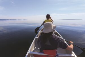 Asian family paddles in the Lake Superior Provincial Park in a calm summer afternoon