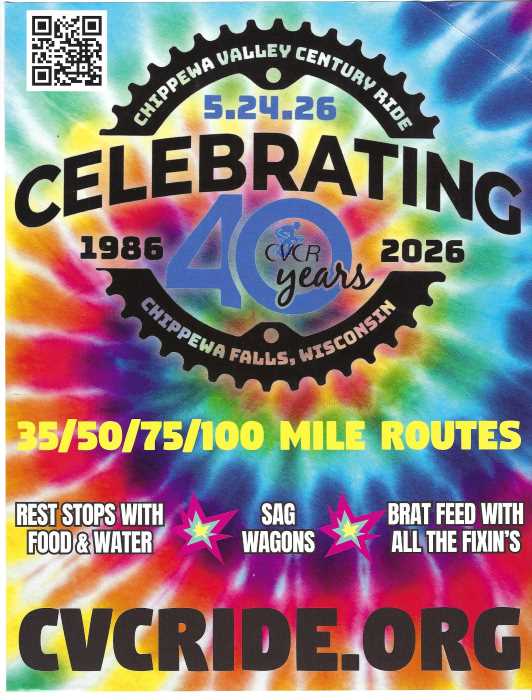 Starting in Chippewa Falls, WI, the Chippewa Valley Century Ride is a not-for-profit bike ride that benefits needs in the Chippewa Valley. Our courses include 35-, 50-, 75-, or 100-mile options, all on blacktop roads. The entry fee covers four rest stops, water stops, support vehicles, and a full meal featuring brats, soda, and beer at the end.